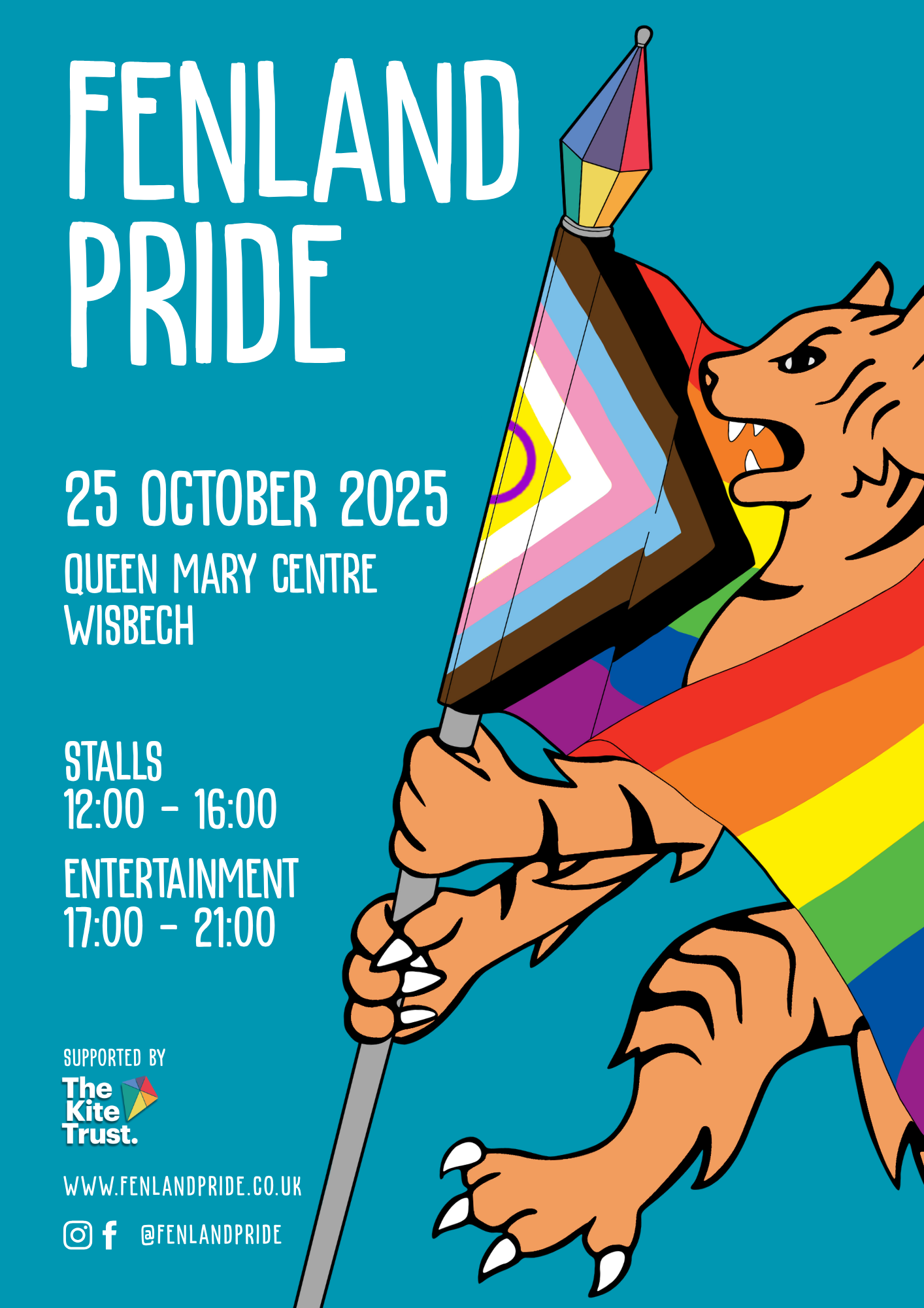 Join us at Fenland Pride on the 25th October 2025 at the Queen Mary Centre, Wisbech, Cambridgeshire! 12:00 – 21:00.
